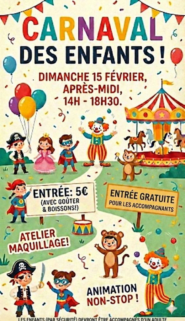 organise un carnaval pour les enfants le dimanche 15 février de 14h à 18h30. Entrée 5 euros pour les enfants avec un goûter (entrée gratuite pour les accompagnants)
