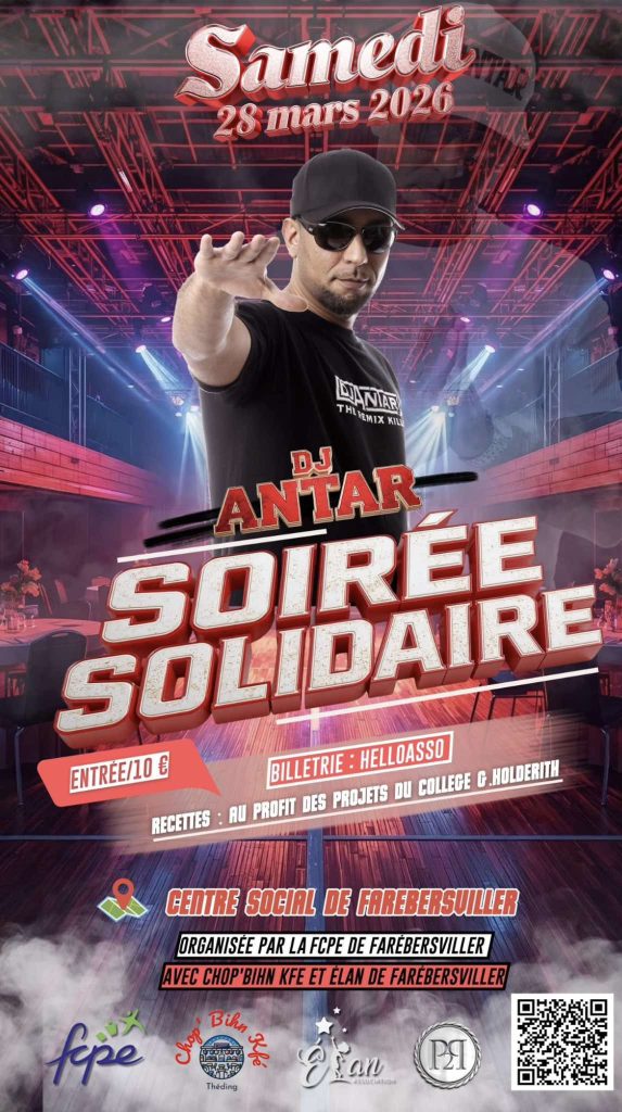 Soirée solidaire organisée par La Fédération des Conseils de Parents d’Elèves (FCPE) de Farébersviller en partenariat avec les associations CHOP’BIN KFE Théding et ELAN Farébersviller; animée par DJ ANTAR au centre social St Exupery à Farebersviller.