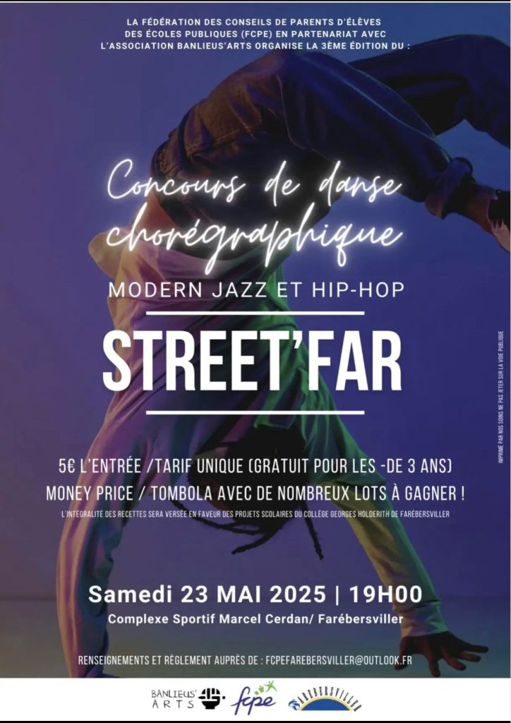 La Fédération des parents d’élèves FCPE en partenariat avec l’association Banlieus Arts vous donne rdv le samedi 23/05/206 à 19h pour la 3eme édition du STREET’FAR : concours de danse moderne jazz et hip-hop.