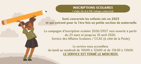 La campagne d’inscription scolaire 2026/2027 sera ouverte à partir du 23 mars et jusqu’au 10 avril 2026 et se tiendra au Service des Affaires Scolaires / CCAS (à côté de la Poste).